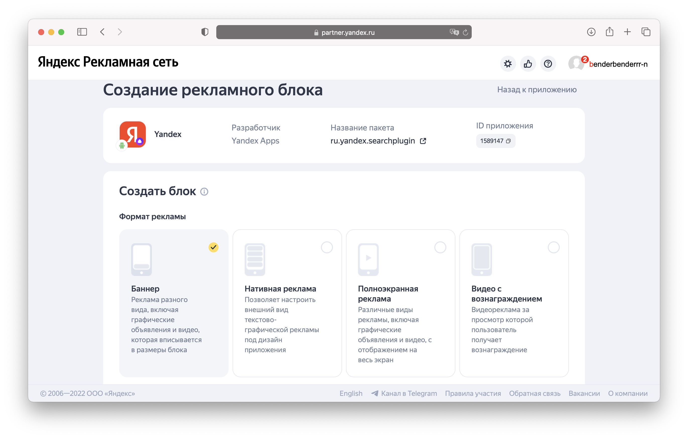При создании блока нужно выбрать формат: баннер, нативная реклама, полноэкранная реклама или видео с вознаграждением. А также указать название блока или стратегию.