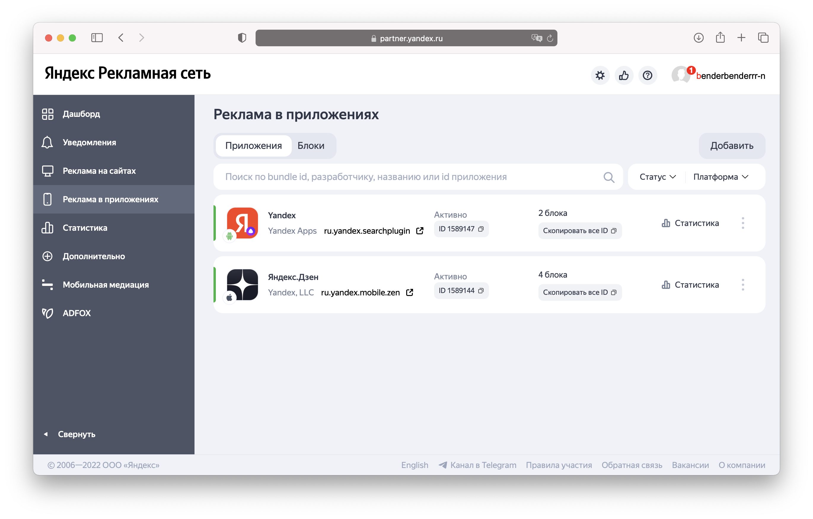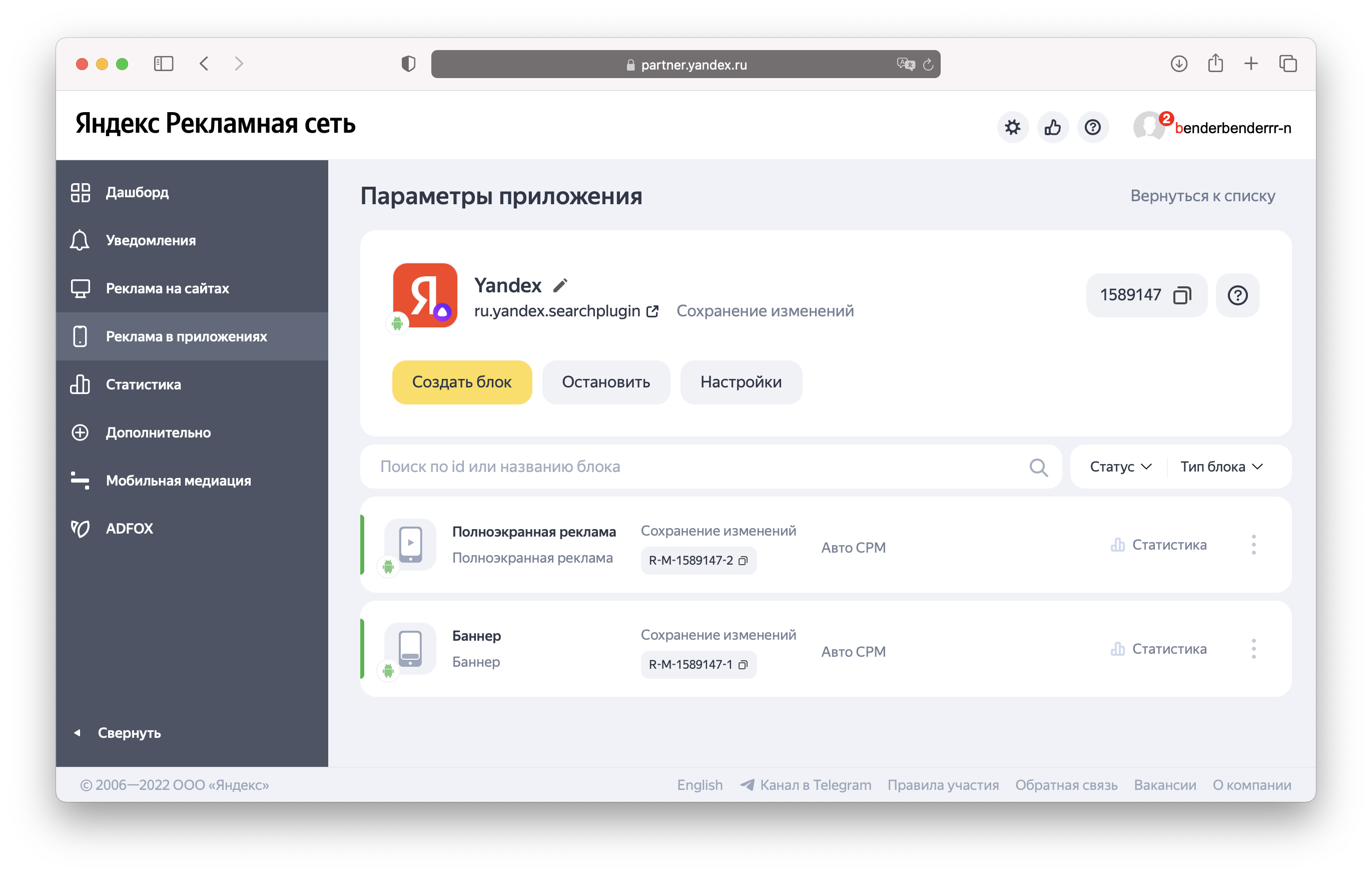 У каждого приложения появилась своя карточка, где отображаются все рекламные блоки этого приложения, а также его настройки.