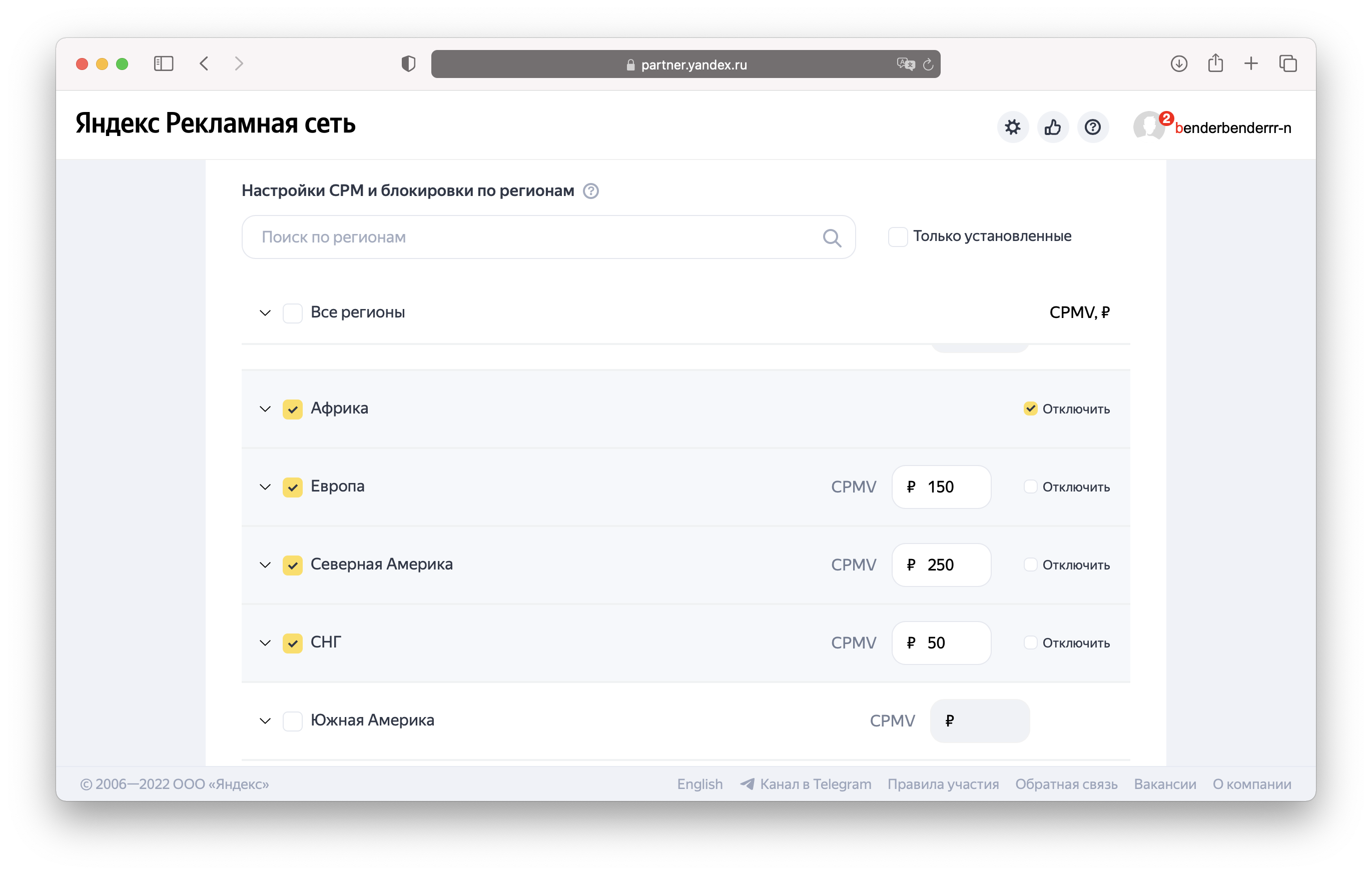 Расширенные настройки рекламного блока доступны для всех созданных рекламных блоков. Среди расширенных настроек доступны, например, настройка географии показа: можно задать разные пороги минимальной цены для разных регионов, а для части регионов отключить показы.